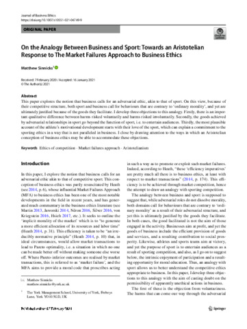 Sinnicks, M. (2022) On the analogy between business and sport: towards an Aristotelian response to the market failures approach to business ethics. Journal of Business Ethics, 177. pp. 49-61. ISSN 1573-0697 doi: 10.1007/s10551-021-04749-9