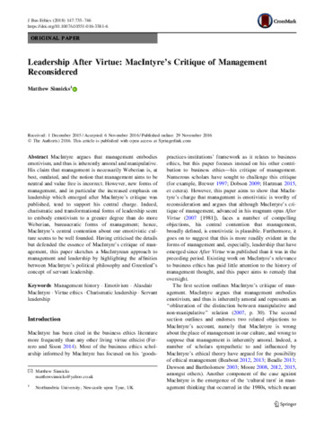 Sinnicks, M. (2018) Leadership after virtue: MacIntyre’s critique of management reconsidered. Journal of Business Ethics, 147 (4). pp. 735-746. ISSN 1573-0697 doi: 10.1007/s10551-016-3381-6