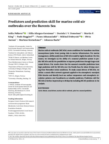 Predictors and prediction skill for marine cold-air outbreaks over the Barents Sea.