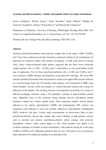 Aromatic poly(fluorocarbinol)s with molecular weights (Mn) in the range 11,000–115,000 g mol-1) have been synthesised and their potential as polymeric binders in ink formulations for deposition by continuous inkjet (CIJ) printers investigated. A small scale, proof of concept study, using a drop-on-demand inkjet printer, suggested that the three lowest molecular weight polymers (Mn = 11,500 – 25,200 g mol-1) could behave as very good binders in this type of application. Two of these poly(fluorocarbinol)s (Mn = 11,500 and 25,200 g mol-1) were analysed as MEK solutions, pre-deposition, using shear-flow rheology. The lower-MW material exhibited Newtonian fluid characteristics whereas the higher-MW polymer behaved as a non-Newtonian fluid. For CIJ printing, both polymers were formulated in MEK using Orasol Orange®, an ionic cobalt dye-complex, to visualise the prints and provide a charge for deflection of ink droplets. The resulting solutions were deposited successfully on a variety of different packaging substrates using a CIJ printhead, resulting in high-resolution printed code. Magnified views of the jetstream during printing showed well-defined droplet formation without any evident satellite drops. These polymeric binders showed limited adhesion to low density poly(ethylene) (LDPE) and polypropylene (PP) surfaces, but moderately good adhesion to steel and excellent adhesion to poly(ethylene terephthalate) (PET), nylon-6,6 and glass. Contact angle measurements on drawn-down films of these poly(fluorocarbinol)s showed that, despite their ready solubility in high-polarity solvents such as alcohols and ketones, poly(fluorocarbinol)s afford coatings with relatively hydrophobic surfaces (water contact angles ca. 90°). Such polymers thus appear to be excellent candidates for binders in inkjet formulations, with materials having Mn in the range 10,000 to 25,000 g mol-1 displaying properties that are very well suited to use in continuous inkjet deposition for coding and marking on an industrial scale.