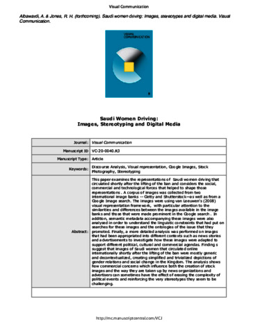 Albawardi, A. and Jones, R. H. orcid id iconORCID: https://orcid.org/0000-0002-9426-727X (2023) Saudi women driving: images, stereotyping and digital media. Visual Communication, 22 (1). pp. 96-127. ISSN 1741-3214 doi: 10.1177/14703572211040851