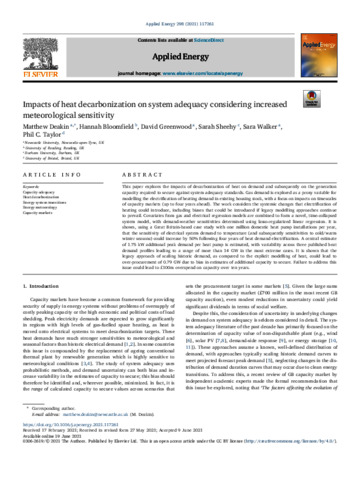 Deakin, M., Bloomfield, H. orcid id iconORCID: https://orcid.org/0000-0002-5616-1503, Greenwood, D., Sheehy, S., Walker, S. and Taylor, P. C. (2021) Impacts of heat decarbonisation on system adequacy considering increased meteorological sensitivity. Applied Energy, 298. 117261. ISSN 0306-2619 doi: 10.1016/j.apenergy.2021.117261