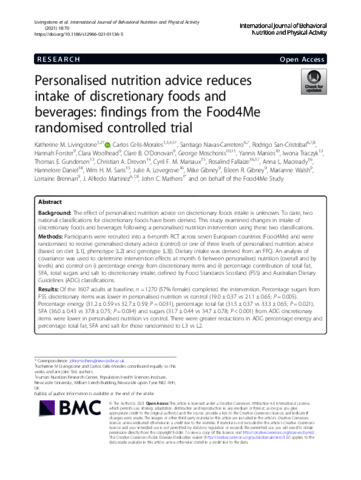 18. Celis-Morales C, Livingstone KM, Marsaux CFM, Forster H, O’Donovan CB, Woolhead C, et al. Design and baseline characteristics of the Food4Me study: a web-based randomised controlled trial of personalised nutrition in seven European countries. Genes Nutr. 2015;10(1):450.