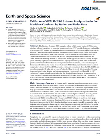 Da Silva, N. A., Webber, B. G. M., Matthews, A. J., Feist, M. M., Stein, T. H. M. orcid id iconORCID: https://orcid.org/0000-0002-9215-5397, Holloway, C. E. orcid id iconORCID: https://orcid.org/0000-0001-9903-8989 and Abdullah, M. F. A. B. (2021) Validation of GPM IMERG extreme precipitation in the Maritime Continent by station and radar data. Earth and Space Science, 8 (7). e2021EA001738. ISSN 2333-5084 doi: 10.1029/2021EA001738