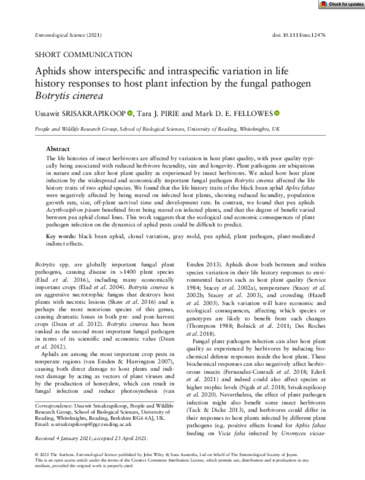 Aphids show interspecific and intraspecific variation in life history responses to host plant infection by the fungal pathogen Botrytis cinerea.