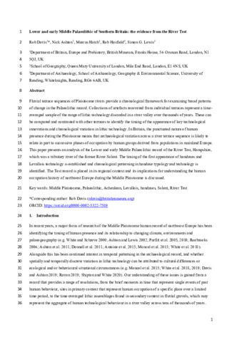 Davis, R., Ashton, N., Hatch, M., Hosfield, R. orcid id iconORCID: https://orcid.org/0000-0001-6357-2805 and Lewis, S. G. (2021) Lower and early middle Palaeolithic of southern Britain: the evidence from the River Test. Journal of Palaeolithic Archaeology, 4. 23. ISSN 2520-8217 doi: 10.1007/s41982-021-00096-3