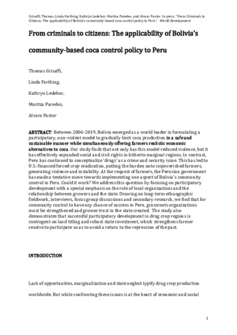 Grisaffi, T., Farthing, L., Ledebur, K., Paredes, M. and Pastor, A. (2021) From criminals to citizens: the applicability of Bolivia’s community-based coca control policy to Peru. World Development, 146. 105610. ISSN 0305-750X doi: 10.1016/j.worlddev.2021.105610