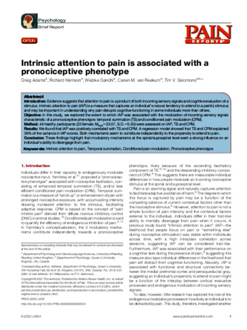 Adams, G. orcid id iconORCID: https://orcid.org/0000-0003-2849-6303, Harrison, R., Gandhi, W. orcid id iconORCID: https://orcid.org/0000-0003-3796-6311, Van Reekum, C. M. orcid id iconORCID: https://orcid.org/0000-0002-1516-1101 and Salomons, T. V. (2021) Intrinsic attention to pain is associated with a pronociceptive phenotype. Pain reports, 6 (2). e934. ISSN 2471-2531 doi: 10.1097/PR9.0000000000000934