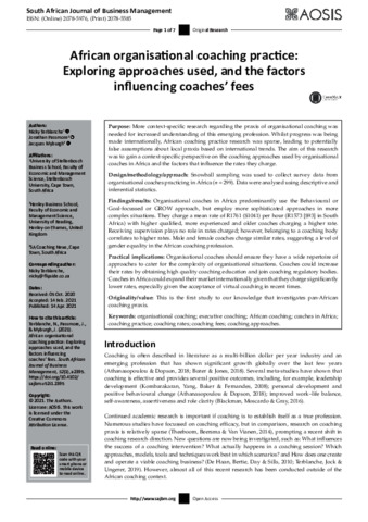 Terblanche, N. orcid id iconORCID: https://orcid.org/0000-0002-6796-6008, Passmore, J. orcid id iconORCID: https://orcid.org/0000-0003-0832-7510 and Myburgh, J. orcid id iconORCID: https://orcid.org/0000-0001-8574-556X (2021) African organisational coaching practice: exploring approaches used, and the factors influencing coaches’ fees. South African Journal of Business Management, 52 (1). ISSN 2078-5585 doi: 10.4102/sajbm.v52i1.2395