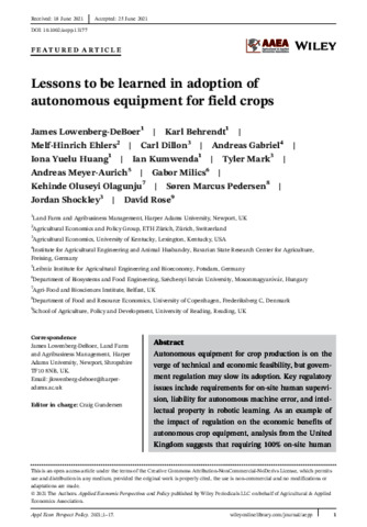 Lowenberg-DeBoer, J., Behrendt, K., Ehlers, M.-H., Dillon, C., Gabriel, A., Huang, I., Kumwenda, I., Mark, T., Meyer-Aurich, A., Milics, G., Olgunju, K. O., Pedersen, S. M., Shockley, J. and Rose, D. (2022) Lessons to be learned in adoption of autonomous equipment for field crops. Applied Economic Perspectives and Policy, 44 (2). pp. 848-864. ISSN 2040-5804 doi: 10.1002/aepp.13177