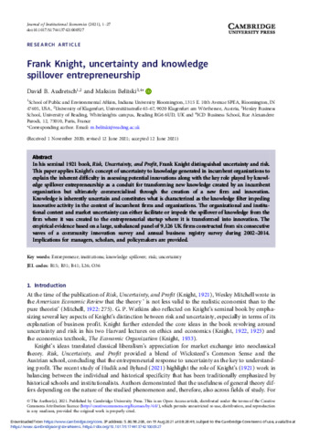 Audretsch, D. B. and Belitski, M. (2021) Frank Knight, uncertainty and knowledge spillover entrepreneurship. Journal of Institutional Economics, 17 (6). pp. 1005-1031. ISSN 1744-1374 doi: 10.1017/S1744137421000527