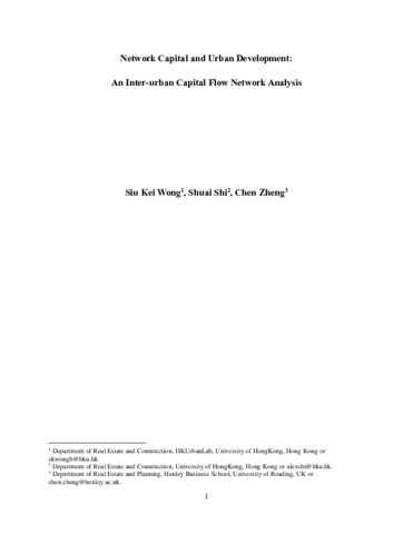 Shi, S., Wong, S. K. and Zheng, C. orcid id iconORCID: https://orcid.org/0000-0002-3480-0167 (2022) Network capital and urban development: an inter-urban capital flow network analysis. Regional Studies, 56 (3). pp. 406-419. ISSN 1360-0591 doi: 10.1080/00343404.2021.1955098