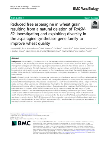 Oddy, J., Alarcón-Reverte, R., Wilkinson, M., Ravet, K., Raffan, S., Minter, A., Mead, A., Elmore, J. S. orcid id iconORCID: https://orcid.org/0000-0002-2685-1773, de Almeida, I. M., Cryer, N. C., Halford, N. G. and Pearce, S. (2021) Reduced free asparagine in wheat grain resulting from a natural deletion of TaASN-B2: investigating and exploiting diversity in the asparagine synthetase gene family to improve wheat quality. BMC Plant Biology, 21. 302. ISSN 1471-2229 doi: 10.1186/s12870-021-03058-7