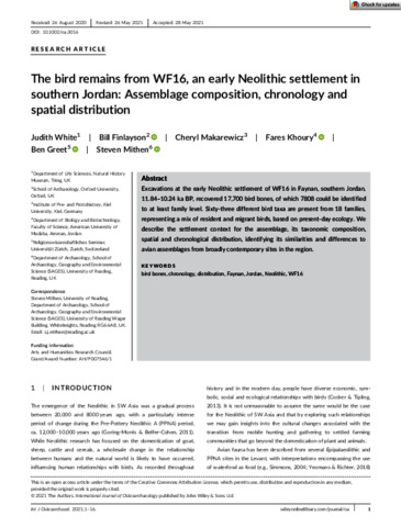 Excavations at the early Neolithic settlement of WF16 in Faynan, southern Jordan, 11.84-10.24 ka BP, recovered 17,700 bird bones, of which 7808 could be identified to at least family level. Sixty-three different bird taxa are present from 18 families, representing a mix of resident and migrant birds, based on present-day ecology. We describe the settlement context for the assemblage, its taxonomic composition, spatial and chronological distribution, identifying its similarities and differences to avian assemblages from broadly contemporary sites in the region.