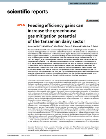 Hawkins, J., Yesuf, G. U. orcid id iconORCID: https://orcid.org/0000-0003-0963-2998, Zijlstra, M., Schoneveld, G. C. and Rufino, M. C. (2021) Feeding efficiency gains can increase the greenhouse gas mitigation potential of the Tanzanian dairy sector. Scientific Reports, 11. 4190. ISSN 2045-2322 doi: 10.1038/s41598-021-83475-8