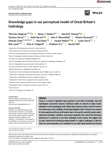 Wagener, T., Dadson, S. J., Hannah, D. M., Coxon, G., Beven, K., Bloomfield, J. P., Buytaert, W., Cloke, H. orcid id iconORCID: https://orcid.org/0000-0002-1472-868X, Bates, P., Holden, J., Parry, L., Lamb, R., Chappell, N. A., Fry, M. and Old, G. (2021) Knowledge gaps in our perceptual model of Great Britain’s hydrology. Hydrological Processes, 35 (7). e14288. ISSN 0885-6087 doi: 10.1002/hyp.14288