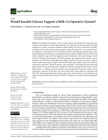 We estimate the monetary value of a policy aimed at increasing rural co-operative production in Kazakhstan to increase milk production. We analyse the drivers associated with public support for such policy using the contingent valuation method. The role of individuals’ psychological aspects, based on the reasoned action approach, along with individuals’ views on the country’s past regime (i.e., to the former Soviet Union), their awareness about the governmental policy, their sociodemographic characteristics, and household location on their willingness to pay (WTP) for the policy is analysed using an interval regression model. Additionally, we examine changes in individuals’ WTP before and during the COVID-19 pandemic. The estimated total economic value of the policy is KZT 1335 bn for the length of the program at KZT 267 bn per year, which is approximately half the total program budget, which includes other interventions beyond the creation of production co-operatives. The total economic value of the policy would equal the cost of the whole program after 10 years, indicating public support for this policy amongst Kazakh citizens. Psychological factors, i.e., attitude, perceived social pressure, and perceived behavioural control, and the respondents’ awareness of the policy and views on the Soviet Union regime are associated with their WTP. Sociodemographic factors, namely, age, income, and education, are also statistically significant. Finally, the effect of the shocks of COVID-19 is negatively associated with the respondents’ WTP.