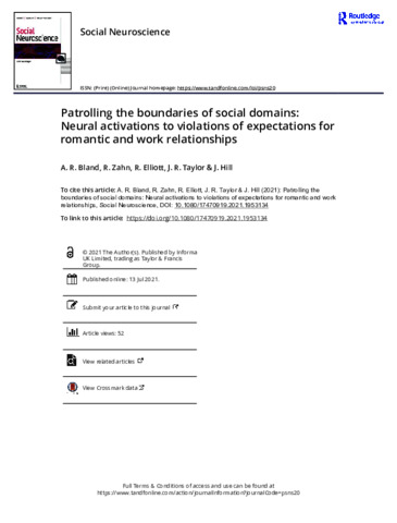 Bland, A. R., Zahn, R. R., Elliott, R., Taylor, J. R. and Hill, J. (2021) Patrolling the boundaries of social domains: neural activations to violations of expectations for romantic and work relationships. Social neuroscience, 16 (5). pp. 513-521. ISSN 1747-0927 doi: 10.1080/17470919.2021.1953134