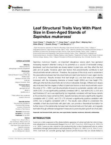 Chang, Y., Xu, C., Yang, H. orcid id iconORCID: https://orcid.org/0000-0001-9940-8273, Zhou, J., Hua, W., Zhang, S., Zhong, Q. and Li, B. (2021) Leaf structural traits vary with plant size in even-aged stands of Sapindus mukorossi. Frontiers in Plant Science, 12. 692484. ISSN 1664-462X doi: 10.3389/fpls.2021.692484