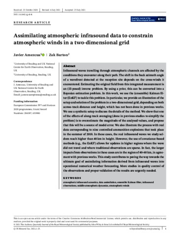 Amezcua, J. and Barton, Z. (2021) Assimilating atmospheric infrasound data to constrain atmospheric winds in a two-dimensional grid. Quarterly Journal of the Royal Meteorological Society, 147 (740). pp. 3530-3554. ISSN 1477-870X doi: 10.1002/qj.4141