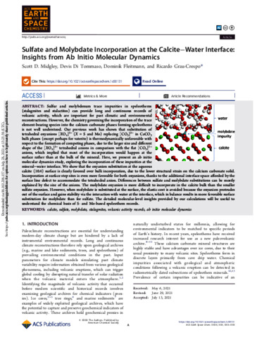 Sulfate and molybdate incorporation at the calcite–water interface: insights from ab initio molecular dynamics.