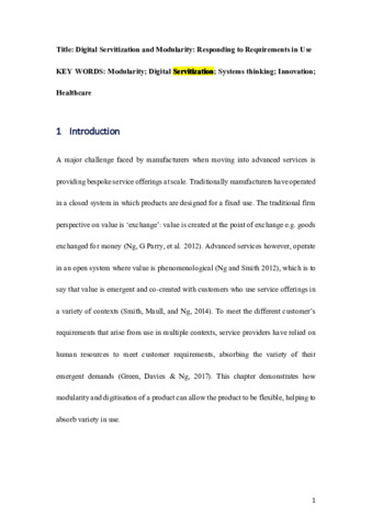 When moving towards digitally enabled advanced services firms are faced with the challenge of servicing heterogeneous customer requirements that emerge during product use. Whereas offers may have been designed with fixed functionality and a focus on stable outcomes, in the advanced service environment providers must respond to a variety of demands emergent from multiple contexts of use. Using a case example from healthcare, this chapter illustrates that adopting a modular systems approach to a firm’s offer enhances its ability to meet customers’ heterogeneous requirements in use. The chapter shows that through the application of modularity, in combination with digital and material technology, products can have the flexibility to absorb variety in use. Modularity and digitisation permit the binding of form and function to be postponed until requirements emerge in use, allowing the organisation to quickly tailor the offering to emergent demand.