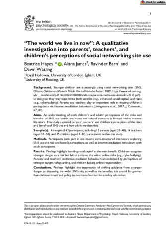 Hayes, B., James, A., Barn, R. and Watling, D. (2022) “The world we live in now”: a qualitative investigation into parents’, teachers’ and children’s perceptions of social networking site use. British Journal of Educational Psychology, 92 (1). pp. 340-363. ISSN 2044-8279 doi: 10.1111/bjep.12452