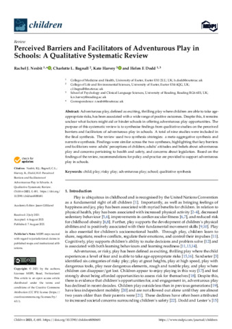 Adventurous play, defined as exciting, thrilling play where children are able to take age-appropriate risks has been associated with a wide range of positive outcomes. Despite this, it remains unclear what factors might aid or hinder schools in offering adventurous play opportunities. The purpose of this systematic review is to synthesise findings from qualitative studies on the perceived barriers and facilitators of adventurous play in schools. A total of nine studies were included in the final synthesis. The review used two synthesis strategies: a meta-aggregative synthesis and narrative synthesis. Findings were similar across the two syntheses, highlighting that key barriers and facilitators were: adults’ perceptions of children; adults’ attitudes and beliefs about adventurous play and concerns pertaining to health; and, safety and concerns about legislation. Based on the findings of the review, recommendations for policy and practice as provided to support adventurous play in schools.