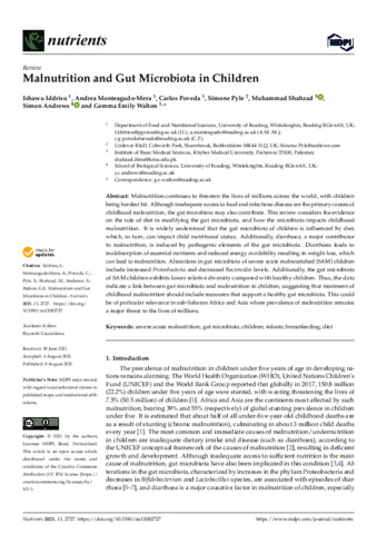 Iddrisu, I., Monteagudo-Mera, A., Poveda, C., Pyle, S., Shahzad, M. orcid id iconORCID: https://orcid.org/0000-0001-6565-1777, Andrews, S. orcid id iconORCID: https://orcid.org/0000-0003-4295-2686 and Walton, G. E. orcid id iconORCID: https://orcid.org/0000-0001-5426-5635 (2021) Malnutrition and gut microbiota in children. Nutrients, 13 (8). 2727. ISSN 2072-6643 doi: 10.3390/nu13082727