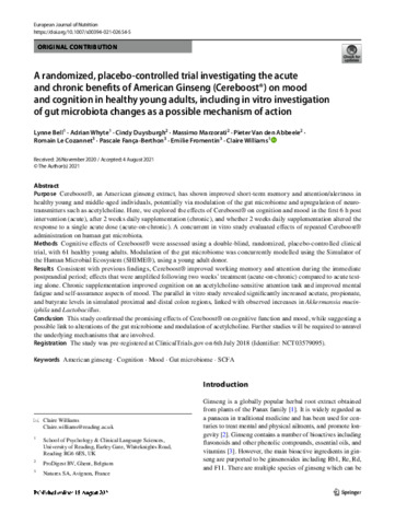 Bell, L. orcid id iconORCID: https://orcid.org/0000-0003-0677-021X, Whyte, A., Duysburgh, C., Marzorati, M., Van den Abbeele, P., Le Cozannet, R., Fança-Berthon, P., Fromentin, E. and Williams, C. orcid id iconORCID: https://orcid.org/0000-0003-4452-671X (2022) A randomized, placebo-controlled trial investigating the acute and chronic benefits of American Ginseng (Cereboost®) on mood and cognition in healthy young adults, including in vitro investigation of gut microbiota changes as a possible mechanism of action. European Journal of Nutrition, 61. pp. 413-428. ISSN 1436-6215 doi: 10.1007/s00394-021-02654-5