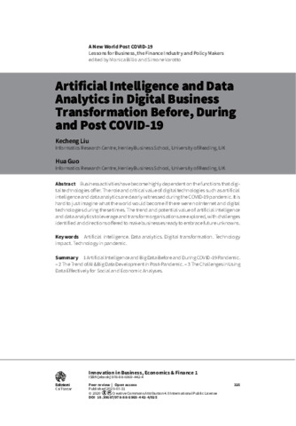 Liu, K. and Guo, H. (2020) Artificial intelligence and data analytics in digital business transformation before, during and post COVID-19. In: Billio, M. and Varotto, S. orcid id iconORCID: https://orcid.org/0000-0001-5328-5327 (eds.) A New World Post COVID-19. Edizioni Ca’Foscari. ISBN 9788869694424 doi: 10.30687/978-88-6969-442-4/025