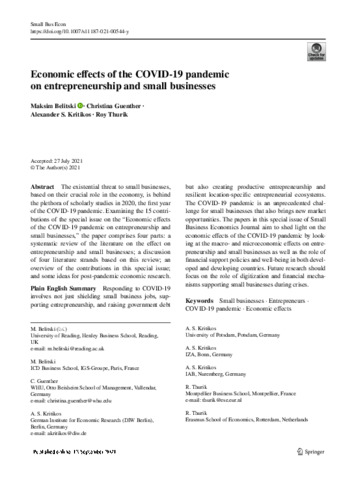 Belitski, M., Guenther, C., Kritikos, A. S. and Thurik, R. (2022) Economic effects of the COVID-19 pandemic on entrepreneurship and small businesses. Small Business Economics, 58. pp. 593-609. ISSN 1573-0913 doi: 10.1007/s11187-021-00544-y