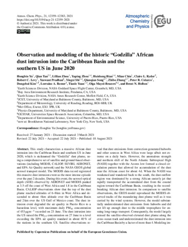 Observation and modeling of the historic “Godzilla” African dust intrusion into the Caribbean Basin and the southern US in June 2020.