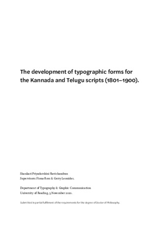 Ravichandran, S. P. (2020) The development of typographic forms for the Kannada and Telugu scripts (1801–1900). PhD thesis, University of Reading. doi: 10.48683/1926.00099826