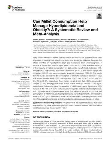 Anitha, S., Botha, R., Kane-Potaka, J., Givens, D. I. orcid id iconORCID: https://orcid.org/0000-0002-6754-6935, Rajendran, A., Tsusaka, T. W. and Bhandari, R. K. (2021) Can millet consumption help manage hyperlipidemia and obesity?: a systematic review and meta-analysis. Frontiers in Nutrition, 8. ISSN 2296-861X doi: 10.3389/fnut.2021.700778