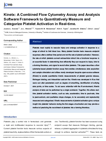 Dunster, J. orcid id iconORCID: https://orcid.org/0000-0001-8986-4902, Mitchell, J., Mohammed, Y., Taylor, K. orcid id iconORCID: https://orcid.org/0000-0002-4599-7727, Gibbins, J. orcid id iconORCID: https://orcid.org/0000-0002-0372-5352 and Jones, C. orcid id iconORCID: https://orcid.org/0000-0001-7537-1509 (2021) Kinetx: a combined flow cytometry assay and analysis software framework to quantitatively measure and categorize platelet activation in real-time. Journal of Visualized Experiments, 176. e62947. ISSN 1940-087X doi: 10.3791/62947