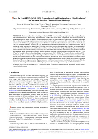 Müller, O. V., Vidale, P. L. orcid id iconORCID: https://orcid.org/0000-0002-1800-8460, Vanniere, B. orcid id iconORCID: https://orcid.org/0000-0001-8600-400X, Schiemann, R. orcid id iconORCID: https://orcid.org/0000-0003-3095-9856 and McGuire, P. C. orcid id iconORCID: https://orcid.org/0000-0001-6592-4966 (2021) Does the HadGEM3-GC3.1 GCM overestimate land precipitation at high resolution? A constraint based on observed river discharge. Journal of Hydrometeorology, 22 (8). pp. 2131-2151. ISSN 1525-755X doi: 10.1175/JHM-D-20-0290.1
