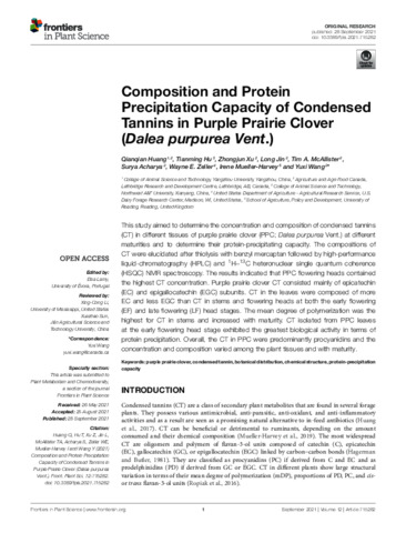 Huang, Q., Hu, T., Xu, Z., Jin, L., McAllister, T. A., Acharya, S., Zeller, W. E., Mueller-Harvey, I. and Wang, Y. (2021) Composition and protein precipitation capacity of condensed tannins in purple prairie clover (Dalea purpurea Vent.). Frontiers in Plant Science, 12. 715282. ISSN 1664-462X doi: 10.3389/fpls.2021.715282